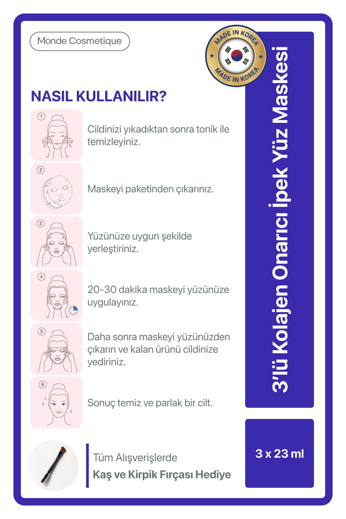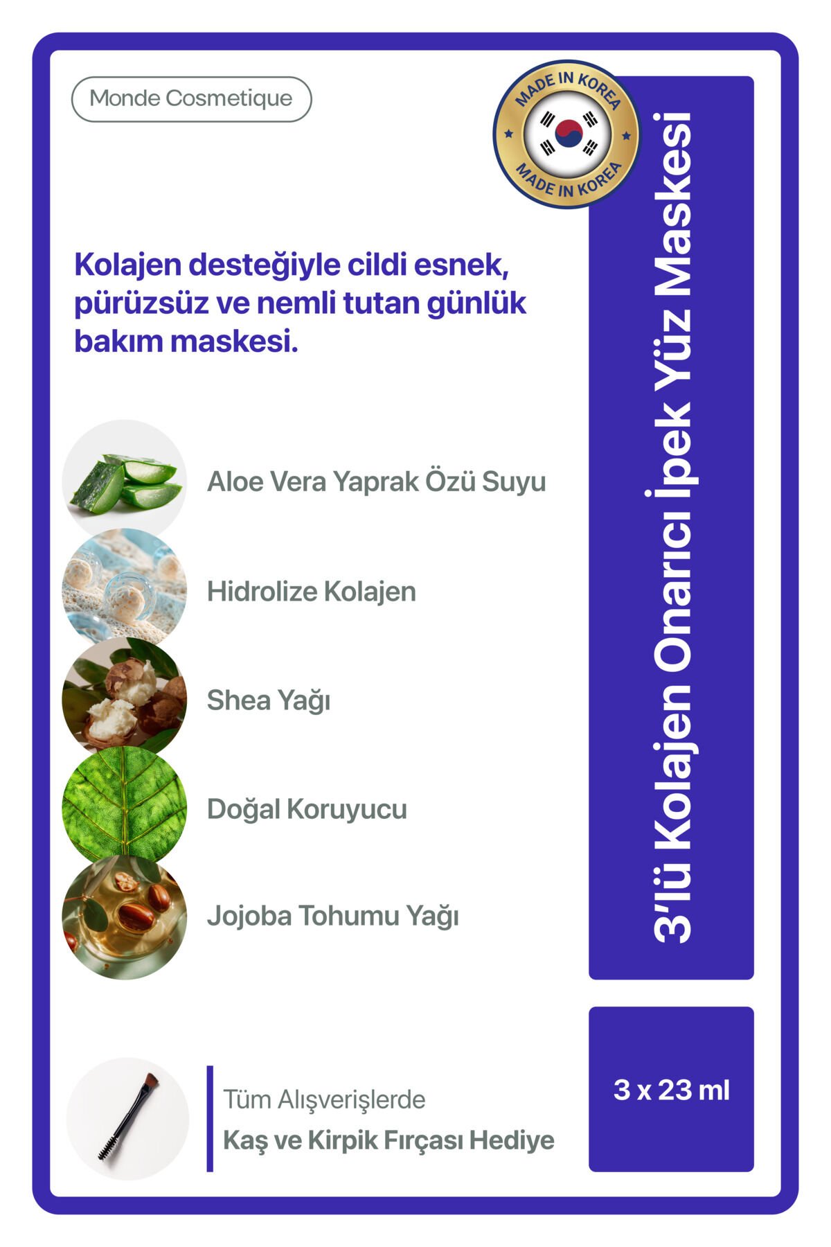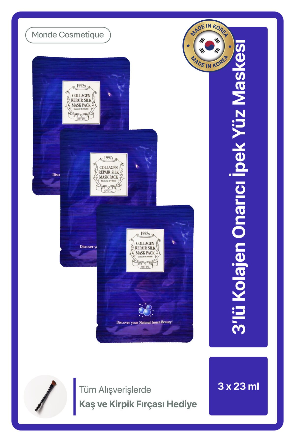 - Tüm cilt tiplerine uygun formülüyle herkesin kullanımına açık, 3'lü kolajen onarıcı ipek yüz maskesi.; - Kağıt tipi yapısı sayesinde cildinize nazikçe uygulanır ve kolayca çıkarılabilir.; - Tek bir pakette 23 ml hacim sunan bu maskeler, cildinize ihtiyacı olan nemi sağlar.; - Onarıcı özelliği ile cildinizin yenilenmesine yardımcı olur ve daha sağlıklı bir görünüm kazandırır.; - Tek ebat tasarımıyla farklı yüz şekillerine uyum sağlar ve rahat bir kullanım sunar.; - Kolajen içeriği sayesinde cildinizin elastikiyetini artırırken, yaşlanma belirtilerine karşı etkili bir bakım sağlar.; - KR menşeli bu ürün, yüksek kalite standartlarına uygun olarak üretilmiştir.