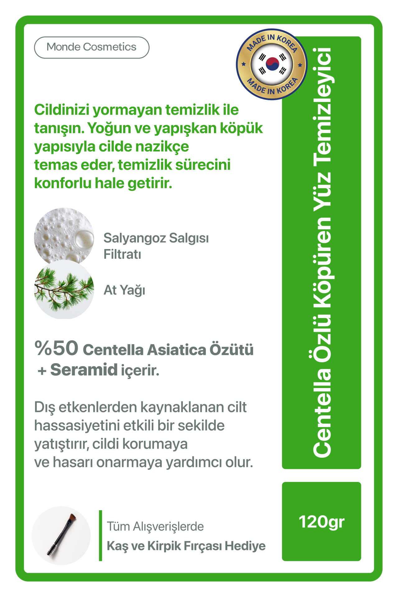 %50 Centella Asiatica (Cica) özü, bitkisel yüzey aktif maddeler ve seramid içeren düşük asitli köpük temizleyici. Cildi nazikçe arındırırken tahriş etmeden temizlik sağlar. Bitkisel bazlı formülü sayesinde ciltteki sürtünmeyi azaltır, cilt bariyerini korur ve nem dengesini destekler. Günlük kullanım için uygundur.