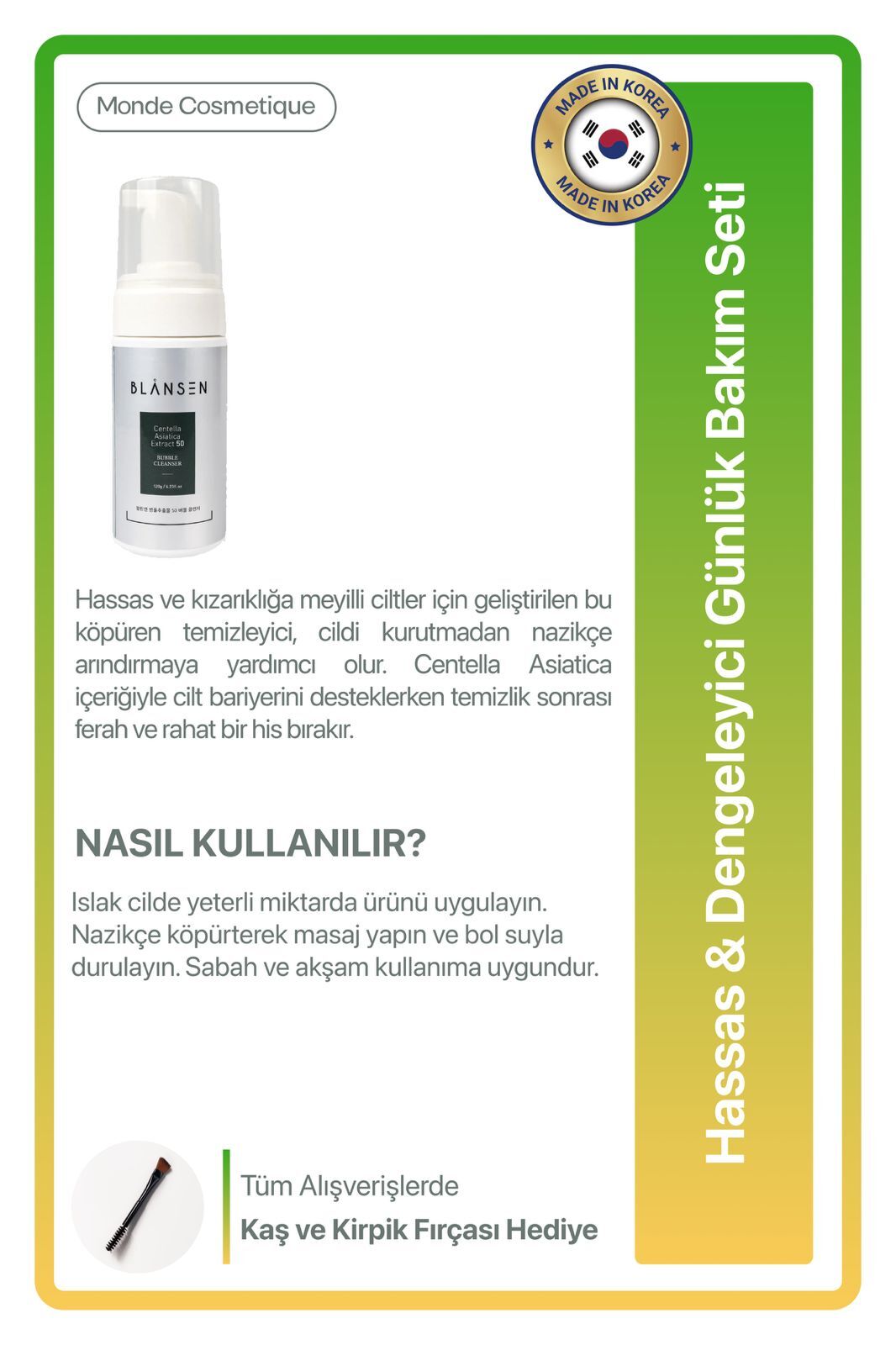 Hassas ve kızarıklığa meyilli ciltler için geliştirilen bu köpüren temizleyici, cildi kurutmadan nazikçe arındırmaya yardımcı olur. Centella Asiatica içeriğiyle cilt bariyerini desteklerken temizlik sonrası ferah ve rahat bir his bırakır.