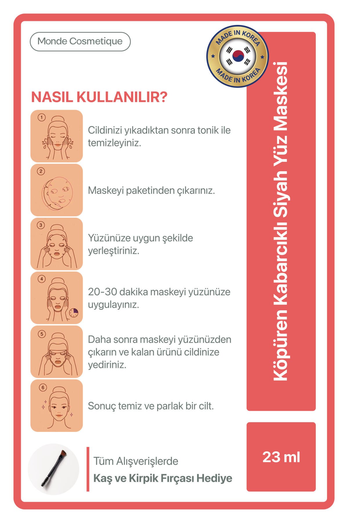 Köpüren Kabarcıklı Siyah Yüz Temizleme Maskesi, ciltle temas ettiğinde aktifleşen mikro kabarcıkları sayesinde gözeneklerin içine nüfuz ederek derinlemesine temizlik sağlar.; Siyah maske formu, cilt yüzeyindeki kir, sebum ve makyaj kalıntılarının arındırılmasına yardımcı olur.; Köpürerek çalışan özel yapısı sayesinde cildi tahriş etmeden temizlerken, daha ferah, pürüzsüz ve taze bir cilt görünümü kazandırır.; Düzenli kullanımda gözenek görünümünün azalmasına ve cildin nefes almasına destek olur.