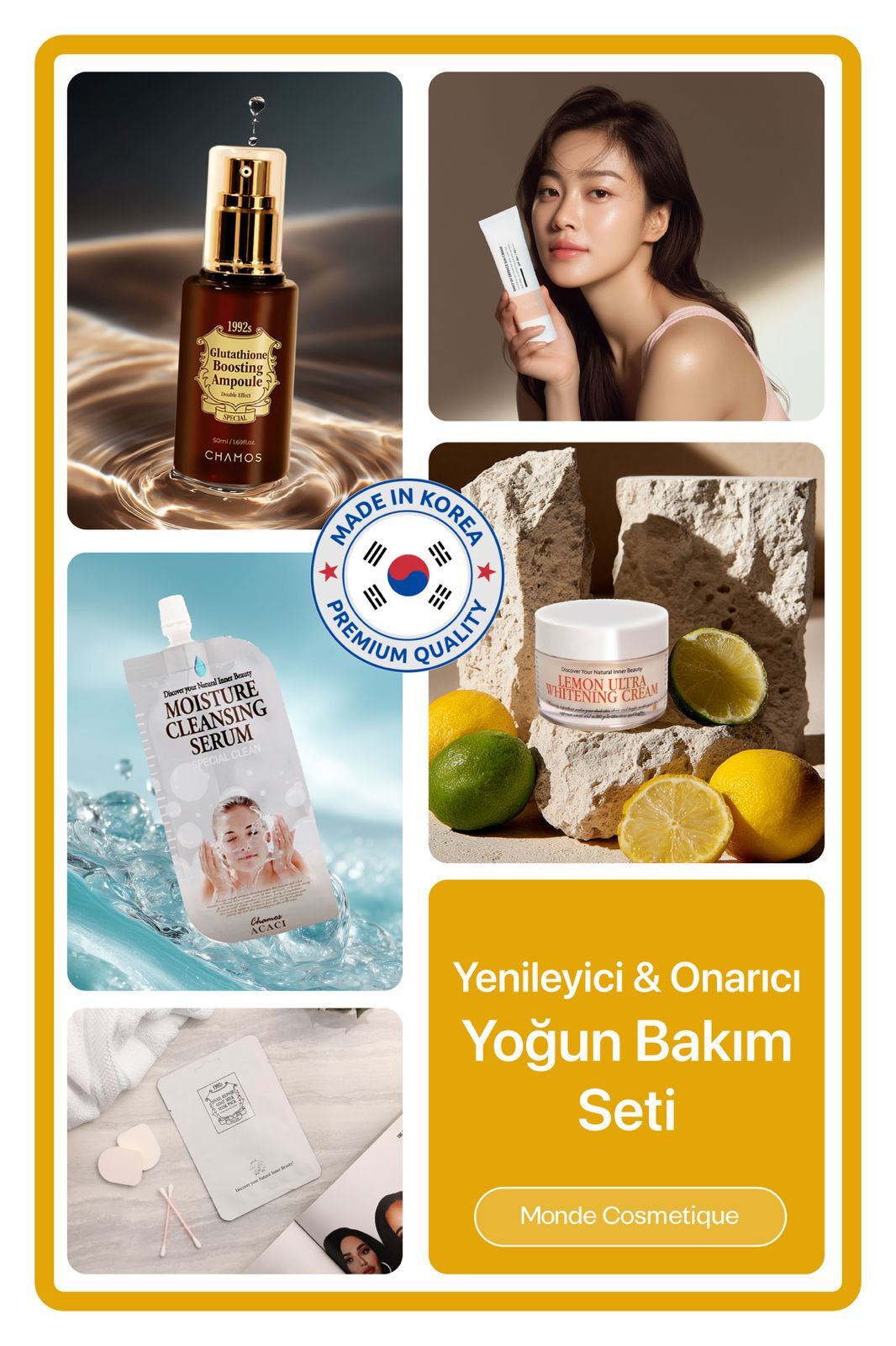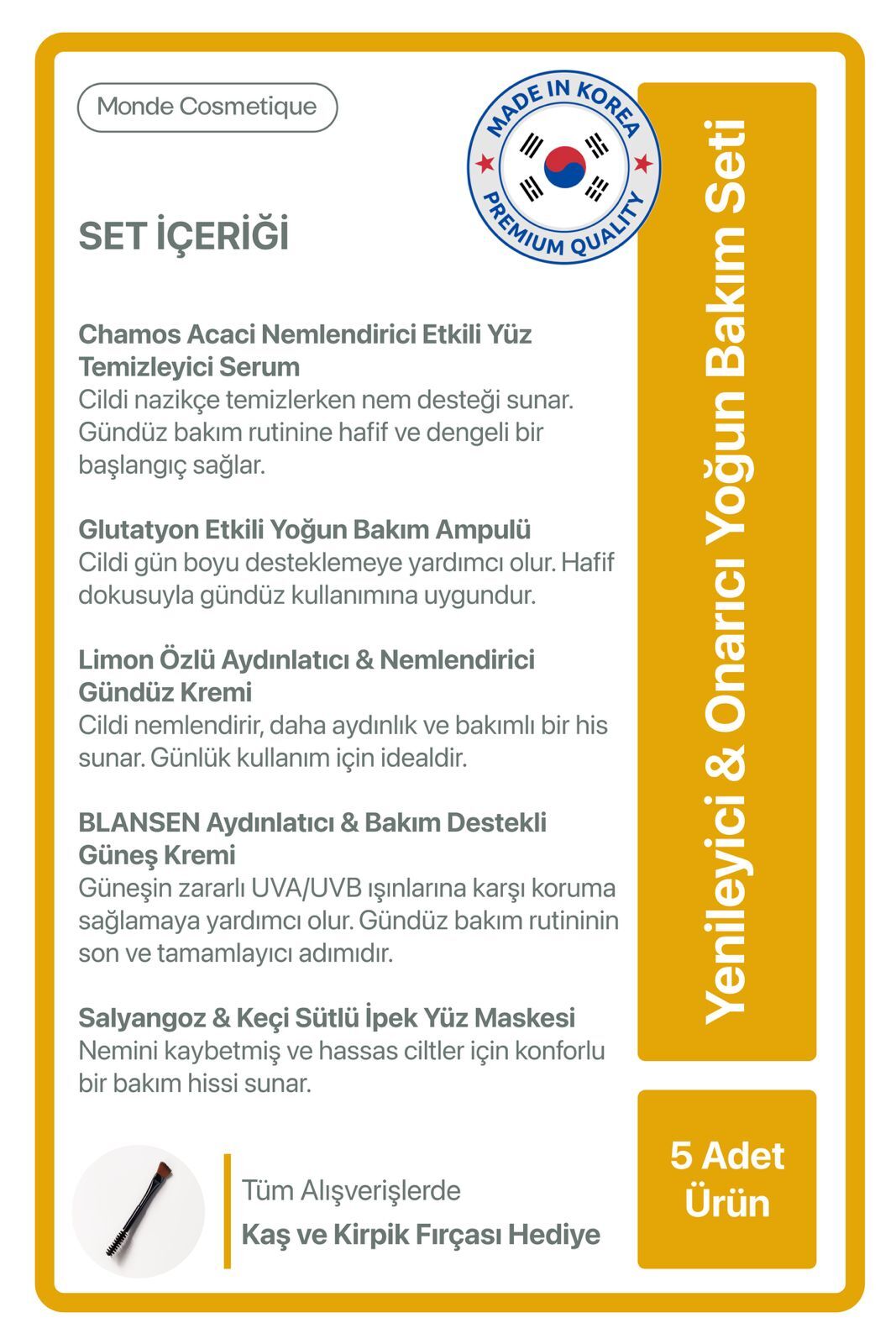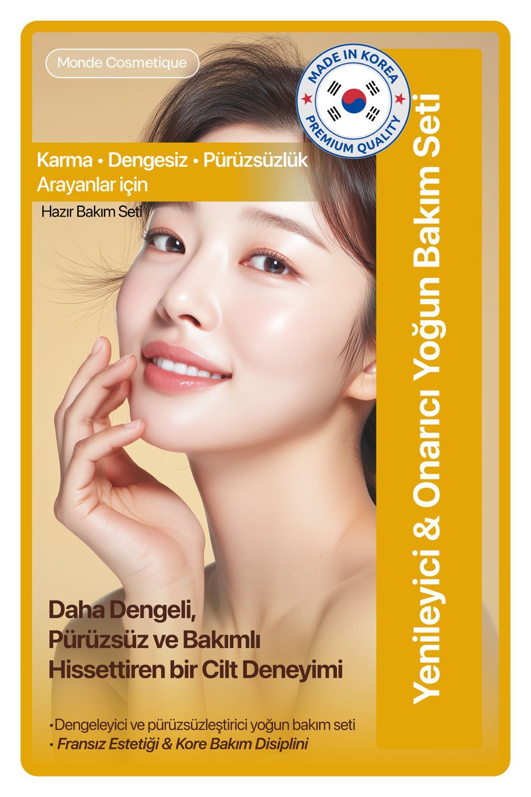 Set; Kore güzellik yaklaşımından ilham alan katmanlı bakım felsefesi ile, Fransız estetiğinin sade ve zahmetsiz bakım anlayışını bir araya getirir. Temizleme, yoğun bakım, maske, nemlendirme ve güneş koruma adımlarını tek bir ritüelde toplayarak cildin daha yumuşak, dengeli ve pürüzsüz hissedilmesine odaklanır.